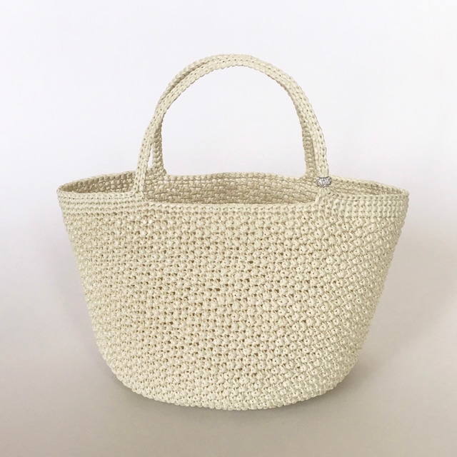 受注製作商品 こちらの商品は、オーダーを受けてから製作をいたします。 発送まで約1ヶ月のお時間を頂いております。 取りだしやすくて入れやすい、たっぷり入る大きめサイズのマルシェバッグ。 肩がけでさらっと持てるのもイイ。 片手で持つのもカッコイイですよね。 木材パルプを原料とする再生繊維で編み上げたので、とても軽くてサラサラの手触りです。 丸底は型崩れしないよう2本取りでしっかりと編み上げました。 持ち手も2本取りで編み上げています。 持ち手にはクリスタルチャームを付けています。 ポンポンと何でも放り込めちゃう気楽さが魅力。 カジュアルにも、キレイめにも、どんなスタイルにも、幅広いスタイルに活躍します。 大人の女性らしさ、上品さがひきたつ、シンプルかつスタイリッシュなバッグです。 ------------------- タイプ:『Cool』 アイボリー サイズ:丸底直径 約20cm 横幅 約38cm 高さ 約22cm 持ち手 約30cm 重 さ:約240g 素 材:レーヨン100% ------------------- 短時間で大量には作れないけれど、手編みならではの「温もり」「優しさ」を感じて、使ってくれる人を思って、心をこめて編んだバッグです。 ベーシックカラーの展開は、どんなコーディネイトにも合わせやすく、毎日使っていただけます。 ※この製品は一点一点丁寧に、すべて手作業で作られています。 そのため多少の編みムラやサイズの誤差が出る場合がございますが、欠陥ではございません。 それも完全ハンドメイドの魅力とご理解頂きますようお願い申し上げます。 ※画面上と実物では多少色具合が異なって見える場合もございます。ご注文の際はあらかじめご了承ください。 ※折りたたんで発送させて頂きますので、形を整えてご利用ください。 ※この商品は送料無料です。
