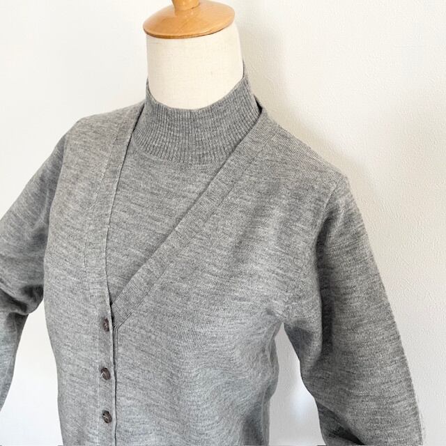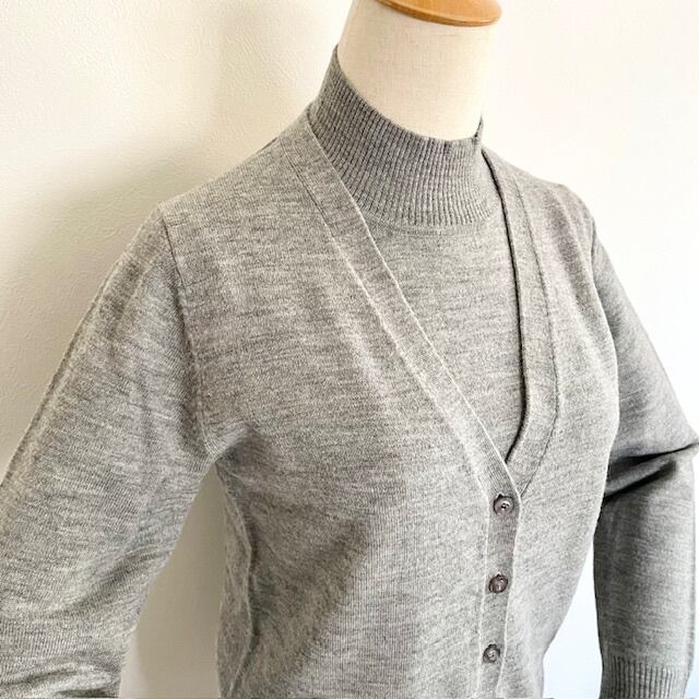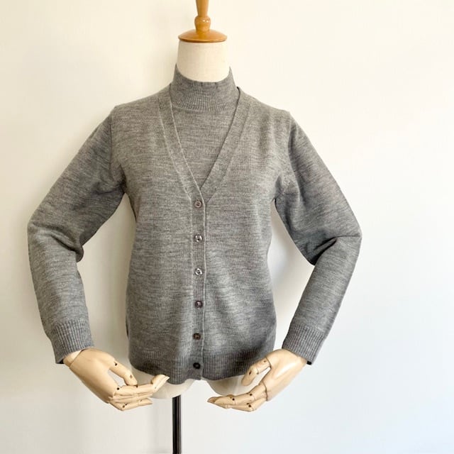 ハイネックニットとベーシックなカーディガンのアンサンブルニット。