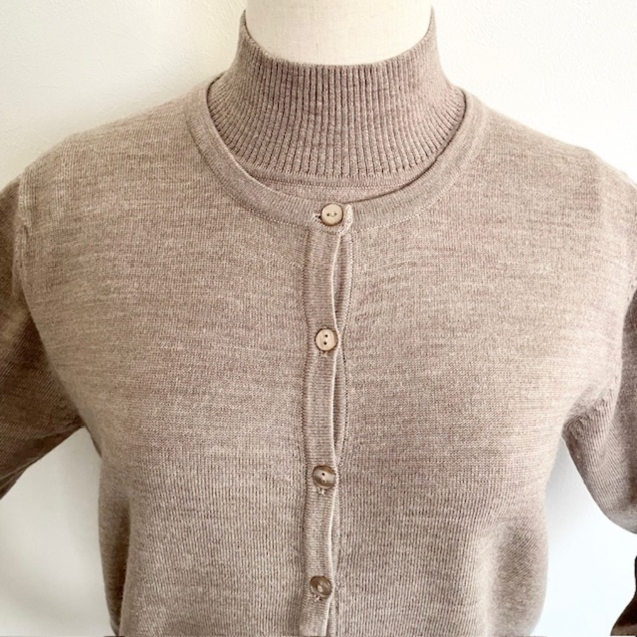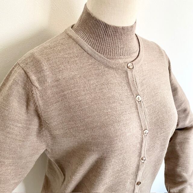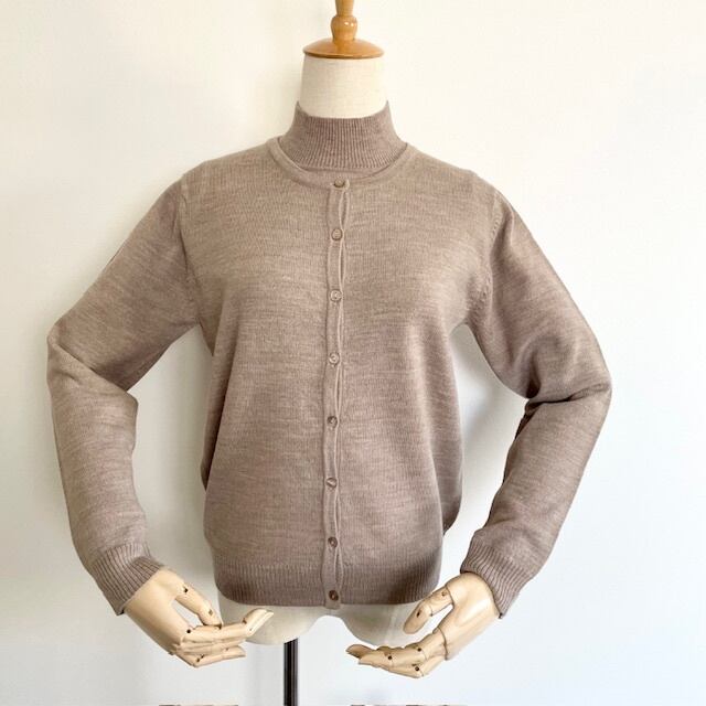 ハイネックニットとベーシックなカーディガンのアンサンブルニット。