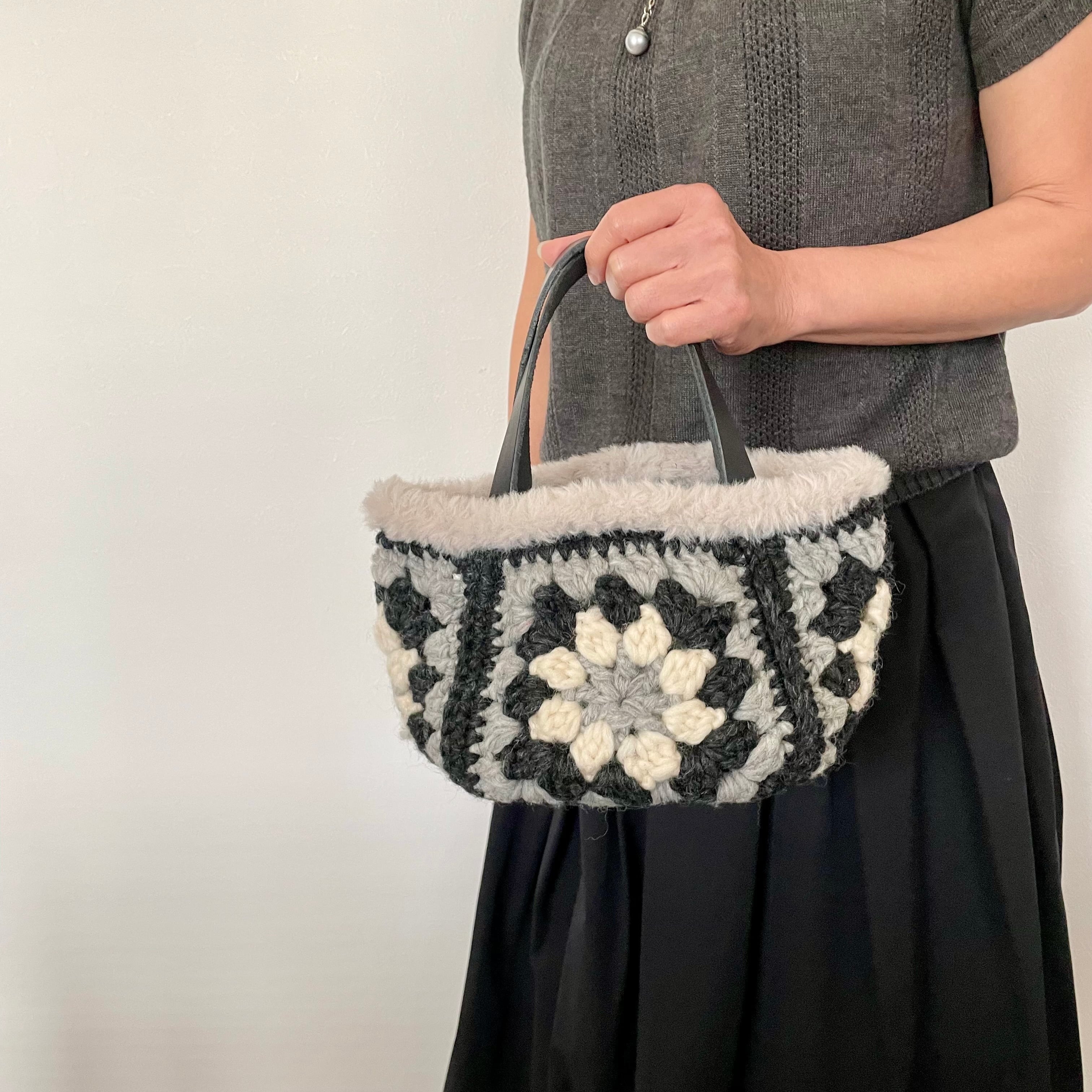 雰囲気のある花柄クロッシェ編みのニットバッグ。