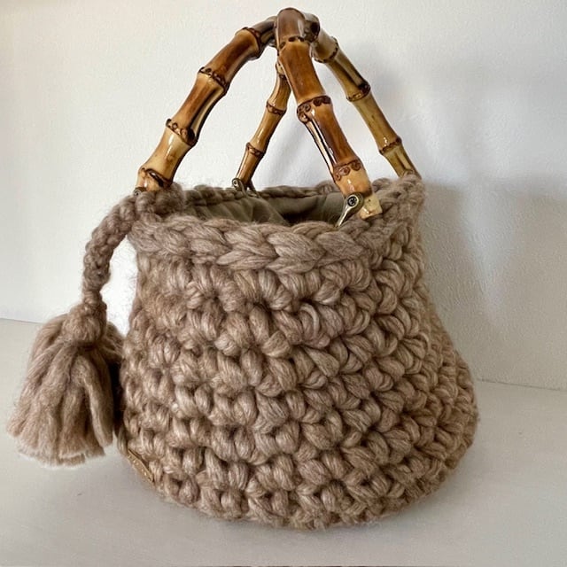 毛糸をたっぷり使ったバンブーハンドルマルシェバッグ。