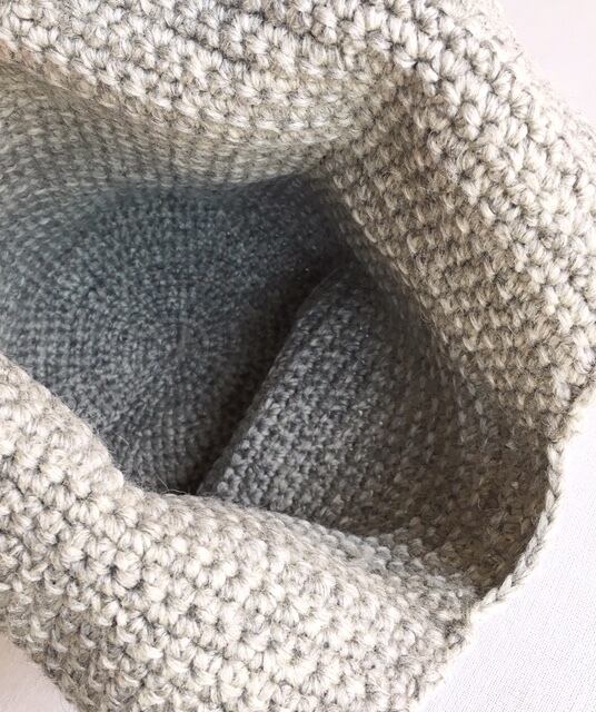 カジュアルさと軽さが特徴の超極太のロービングタイプの毛糸(英国羊毛100%)を使用して編みあげています。