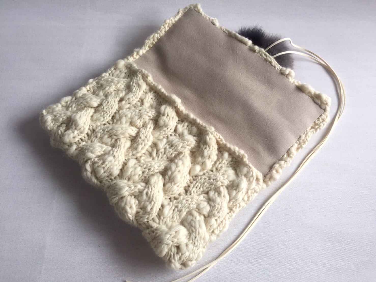 ニットの編み物、芯貼り、内布生地縫い付け、すべて手作業で仕上げたニットクラッチバッグです。