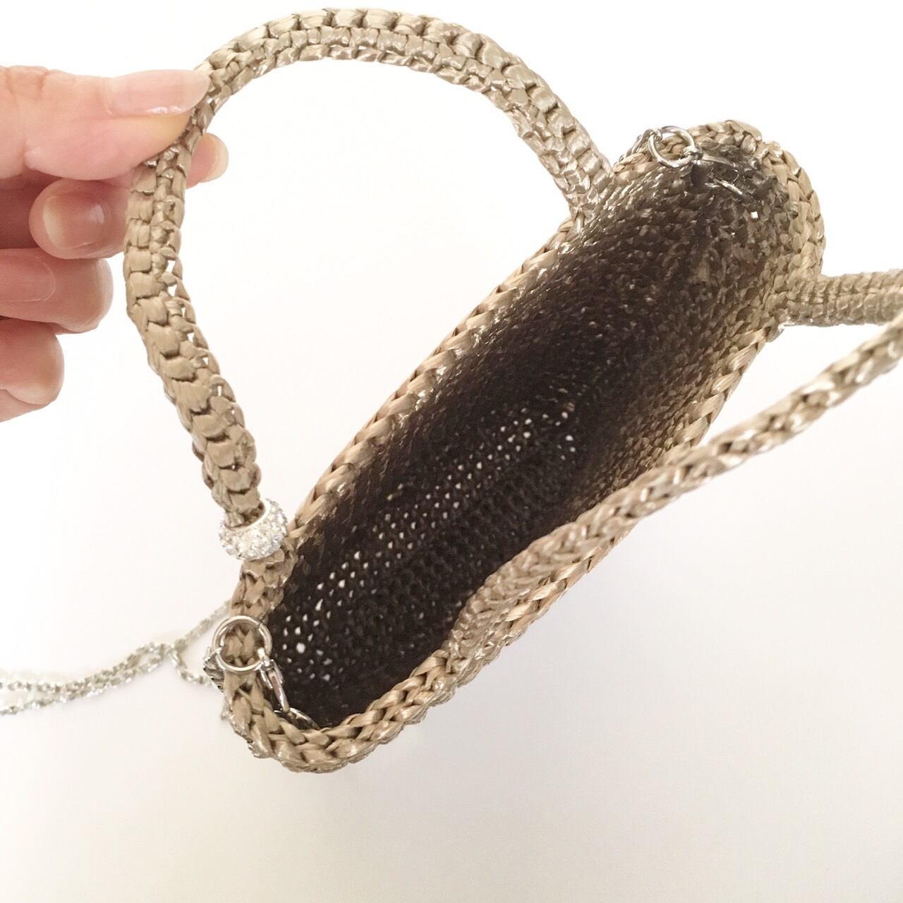 キラキラ光るブライトヤーンで編み上げたバッグは、ベーシックな形だけど在感抜群です。