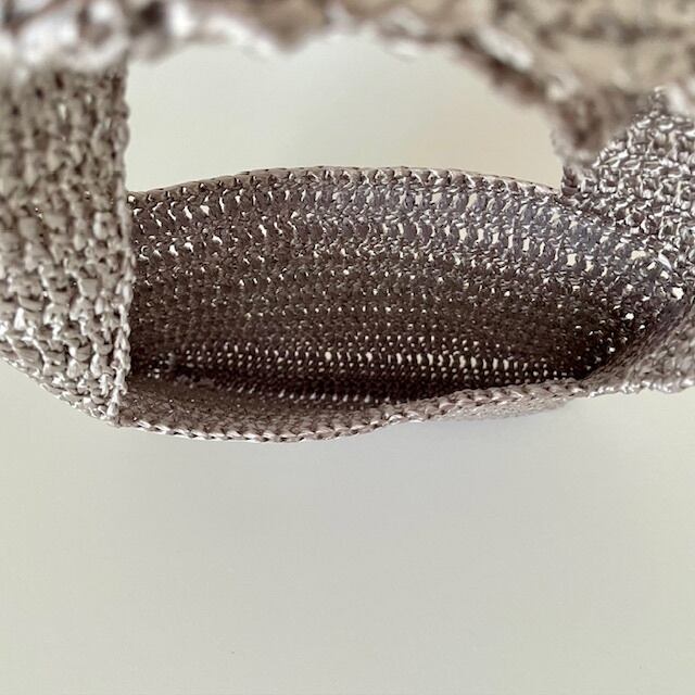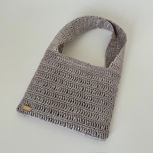 キラキラ光るブライトヤーンで編み上げたバッグは、ベーシックな形だけど在感抜群です。